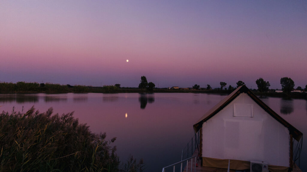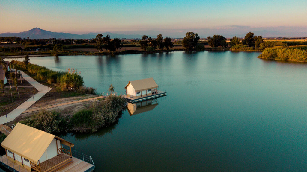 Di giorno si può godere di infinite esperienze a contatto con la natura: dalla colazione sul pontile di legno della tenda del Glamping a un romantico picnic sulla riva del lago; da una passeggiata in bicicletta a un giro in pedalò; dall’emozione di imparare a pilotare una barca a vela a quella di scrutare le tante varietà di uccelli nascosti tra gli alberi, praticando birdwatching. E poi, partecipare a corsi di yoga e pilates sul prato, andare a cavallo, grazie al vicino maneggio, navigare in canoa sui laghi oppure in kayak, o magari rilassarsi su un’amaca e terminare la giornata con una cena romantica servita nella tenda.