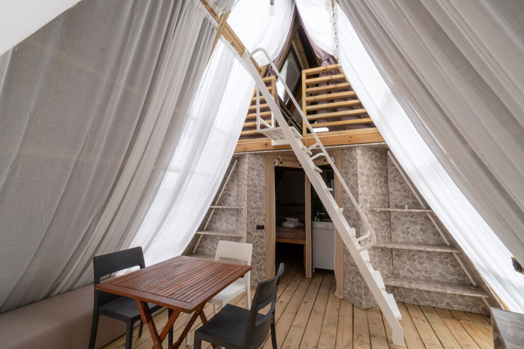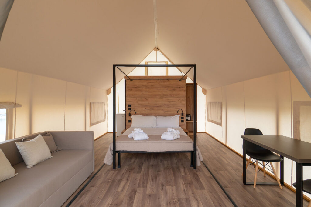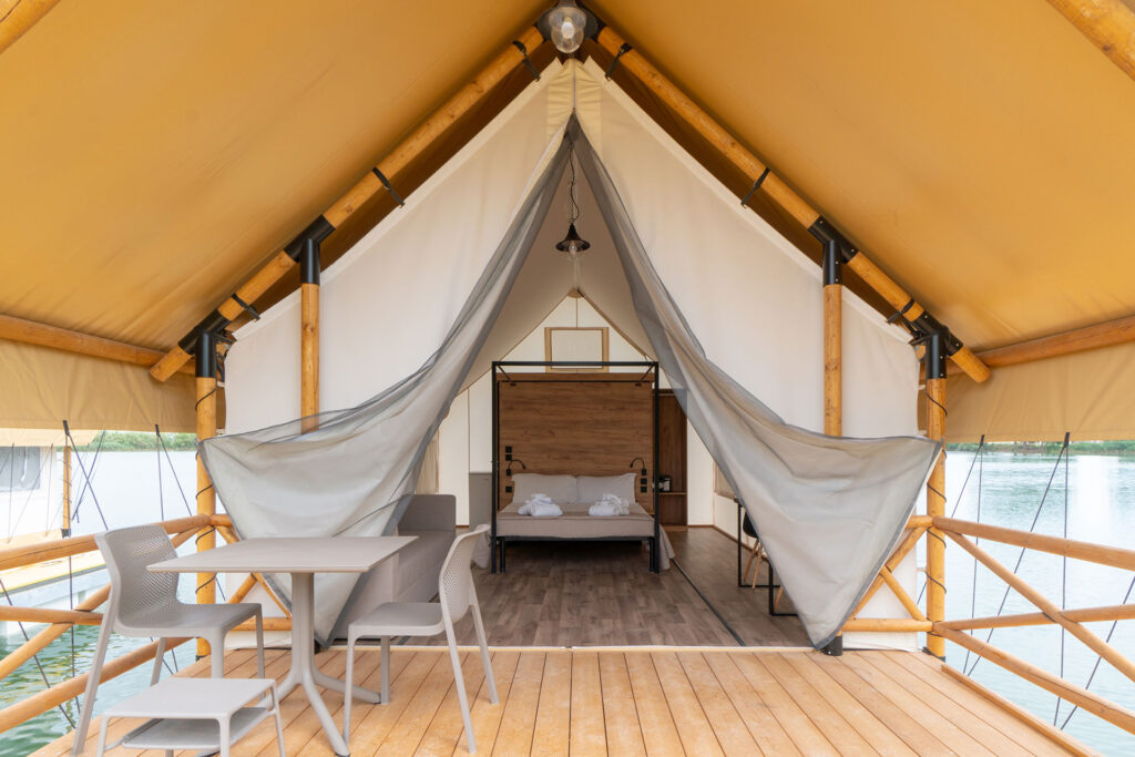 Ideali per vivere l’esperienza del campeggio in modo glamour, le tende galleggianti o a bordo lago con patio esterno privato, dispongono di letto matrimoniale king size e bagno con doccia. Ci sono poi le suite: luminose e in stile moderno, dotate di patio esterno privato vista lago e vasca idromassaggio Jacuzzi privata all’aperto. E ancora i lodge, arredati con gusto ed eleganza, con affaccio sul lago, patio esterno privato e sdraio, e all’interno camino elettrico a muro. In tutti gli alloggi è possibile prenotare il servizio in camera per una colazione indimenticabile o una cena a lume di candela.