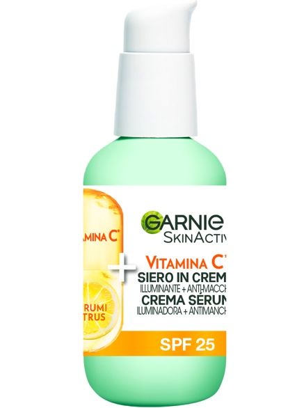 Il potere illuminante di un siero con Vitamina Cg e l’efficacia idratante di una crema viso SPF 25 combinati in un unico prodotto.