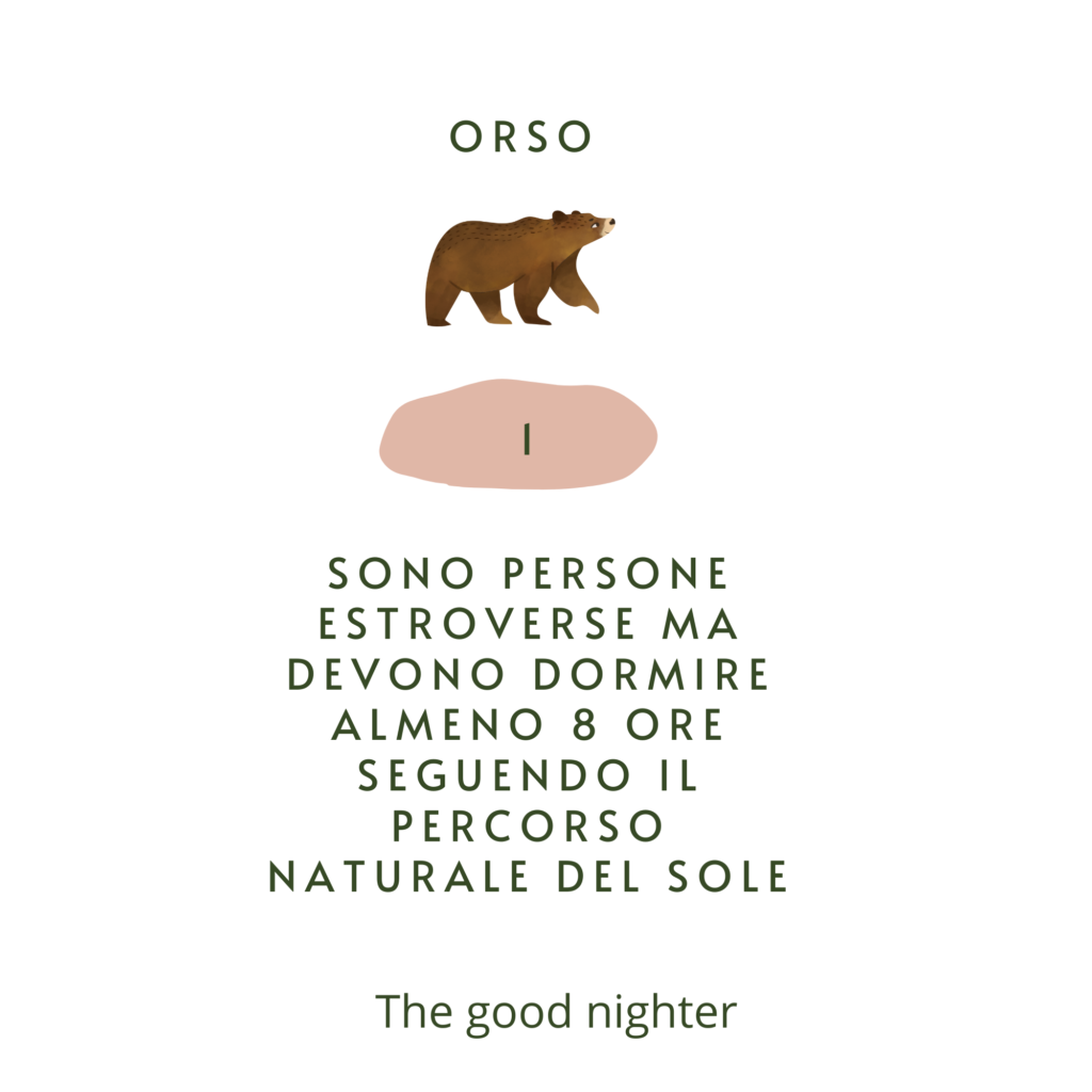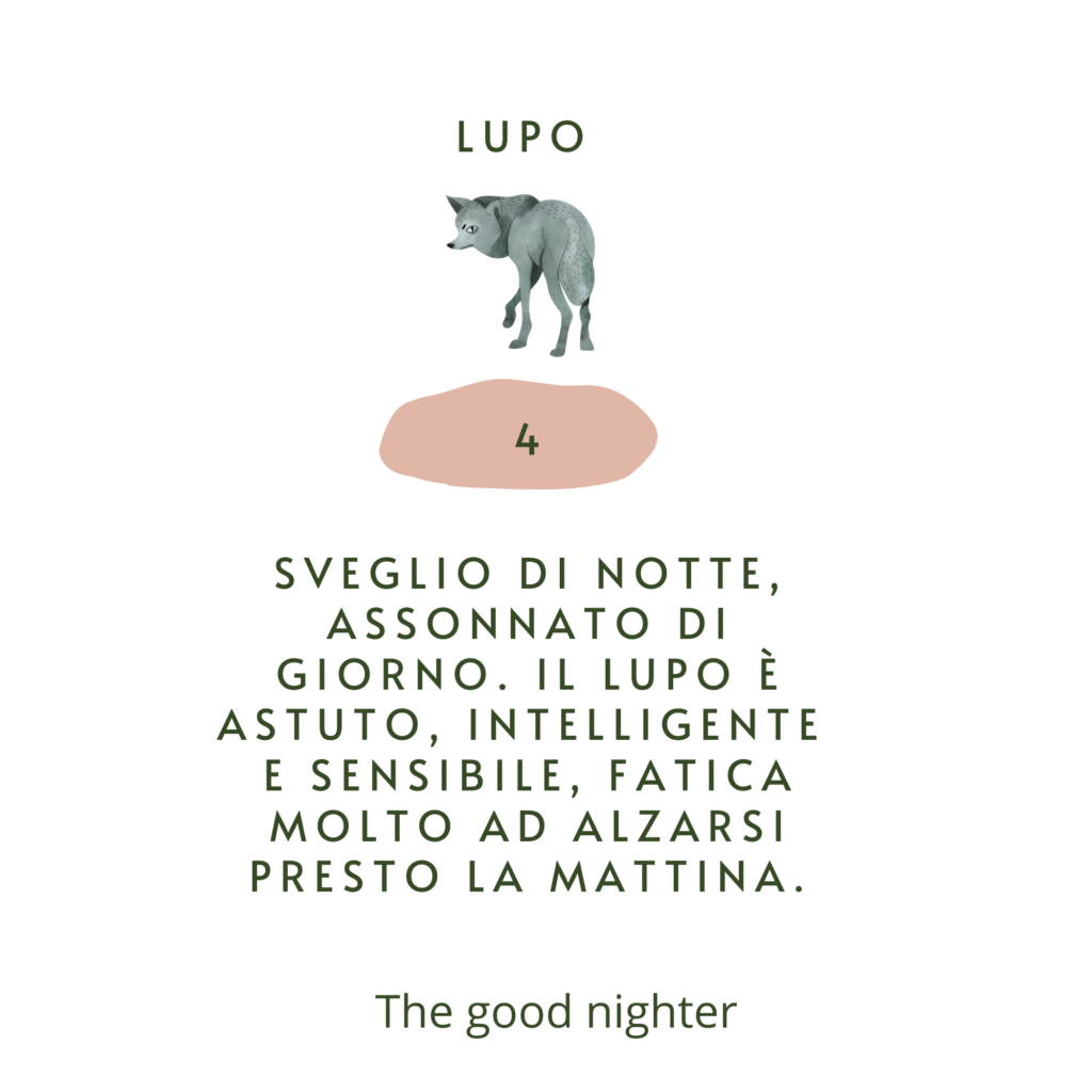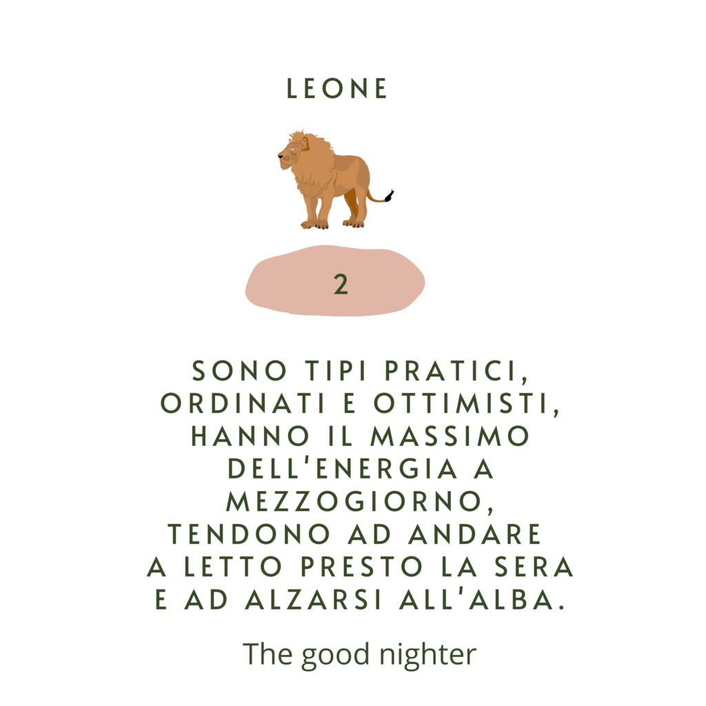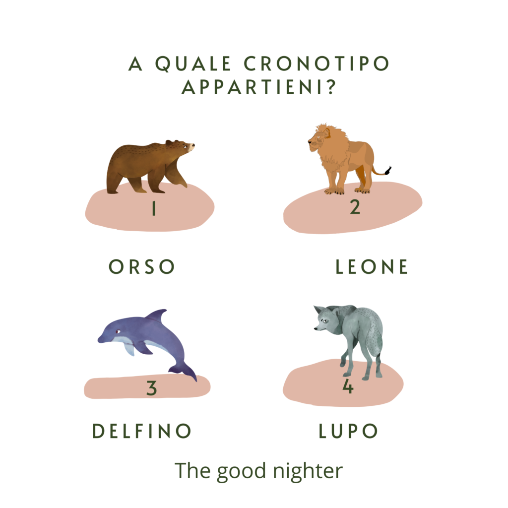 Il dottor Michael Breus a seconda delle caratteristiche del sonno, dei livelli ormonali e della personalità ha suddiviso i cronotipi in quattro categorie diverse: Orso, Lupo, Leone e Delfino.