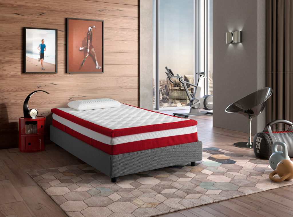 Pensata e studiata per tutti coloro che praticano sport a livello agonistico e anche amatoriale, questa proposta presenta nuove e innovative tecnologie – impiegate in primis su materassi e guanciali – per dare il giusto supporto al sistema neuro-muscolare e all’organismo in generale. Si tratta di ReticolDRY®, una schiuma portante e porosa a cella completamente aperta, totalmente traspirante per facilitare il passaggio dell’aria e la dispersione dell’umidità. La sua propensione ad assorbire le pressioni garantisce il corretto allineamento della colonna vertebrale, agevola il recupero muscolare e ne rilassa la massa, non crea punti di pressione, aumentando così il rilassamento del corpo. In questo modo, i tempi di addormentamento diminuiscono e la qualità del sonno e della piacevole sensazione di recupero aumentano. Inoltre, grazie alla sua composizione, garantisce un’assoluta protezione contro batteri e muffe e mantiene la sua portanza nel tempo. Ma se questa è l’anima del materasso Ambition Pro, il rivestimento texturato Vulcano, impiegato nei laterali del materasso, e l’inserto antislip sono l’abito.