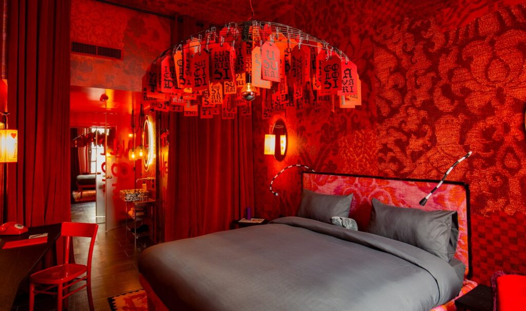 Le camere dell’inferno sono arredate tutte con rossi intensi e riferimenti ai vari gironi danteschi.