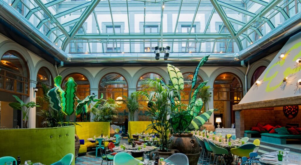 La luce che vi filtra illumina il grande ambiente decorato con enormi e rigogliose piante in vaso, rendendolo un luogo magico in ogni momento della giornata.