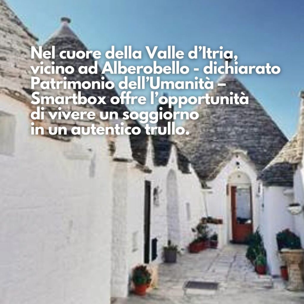 Nel cuore della Valle d’Itria, vicino ad Alberobello – dichiarato Patrimonio dell’Umanità – Smartbox offre l’opportunità di vivere un soggiorno indimenticabile in un autentico trullo. Lì dove il tempo sembra essersi fermato, sarà possibile circondarsi di bellezza autoctona: tetti a cono, pareti in pietra e un’atmosfera d’altri tempi si uniscono a tutti i comfort moderni. Di contorno la bellezza della campagna pugliese e delle spiagge dorate. Da non dimenticarsi le prelibatezze della cucina locale, accompagnate dalla vivace atmosfera dei mesi estivi.