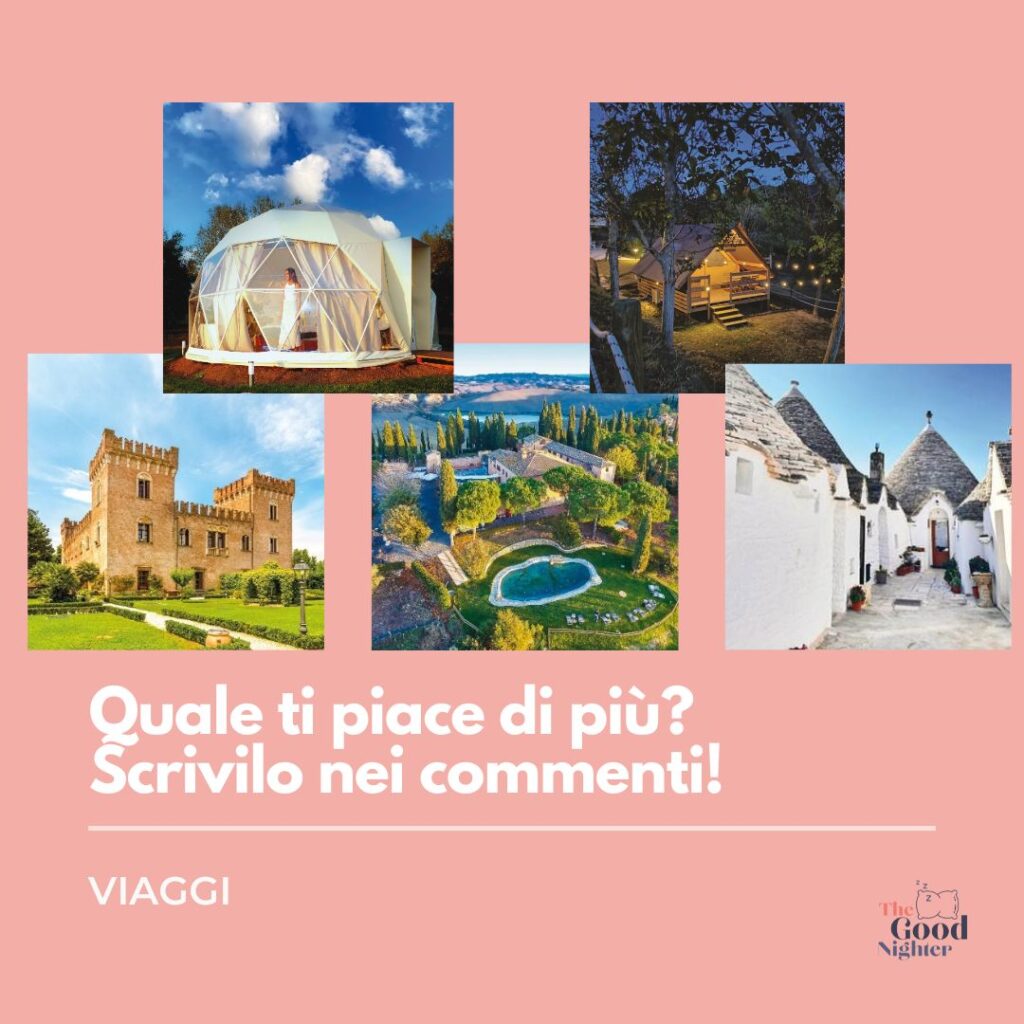 Viaggiare ha diversi scopi: relax, avventura, condividere attimi con i propri cari… e la location ricopre sempre un ruolo importante. Vivere una cena all’interno di un tipico trullo pugliese o in un castello fiabesco che traspira storia, oppure dormire in una tenda glamour, in una bolla o in una cupola trasparente sotto il cielo stellato non sono solo esperienze da provare almeno una volta nella vita, ma anche da regalare per suscitare un’inaspettata sorpresa nel destinatario.