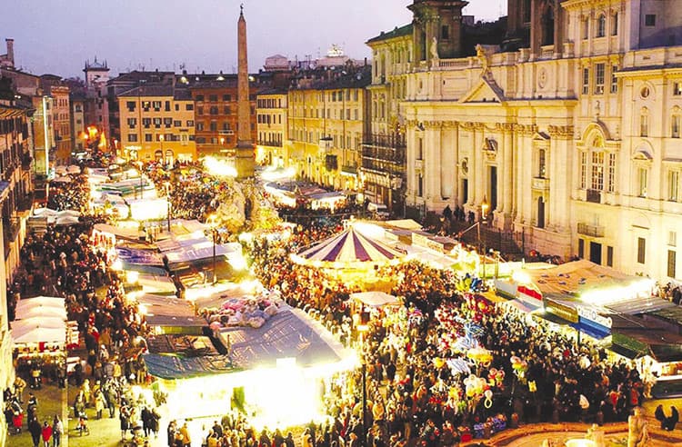 Da Civitavecchia, Roma apre le sue porte con il celebre mercatino di Piazza Navona, un tripudio di giostre d’altri tempi, calze della Befana artigianali e golosità come torrone e panettone. Ogni angolo è un invito a vivere l’incanto natalizio tra arte e sapori.